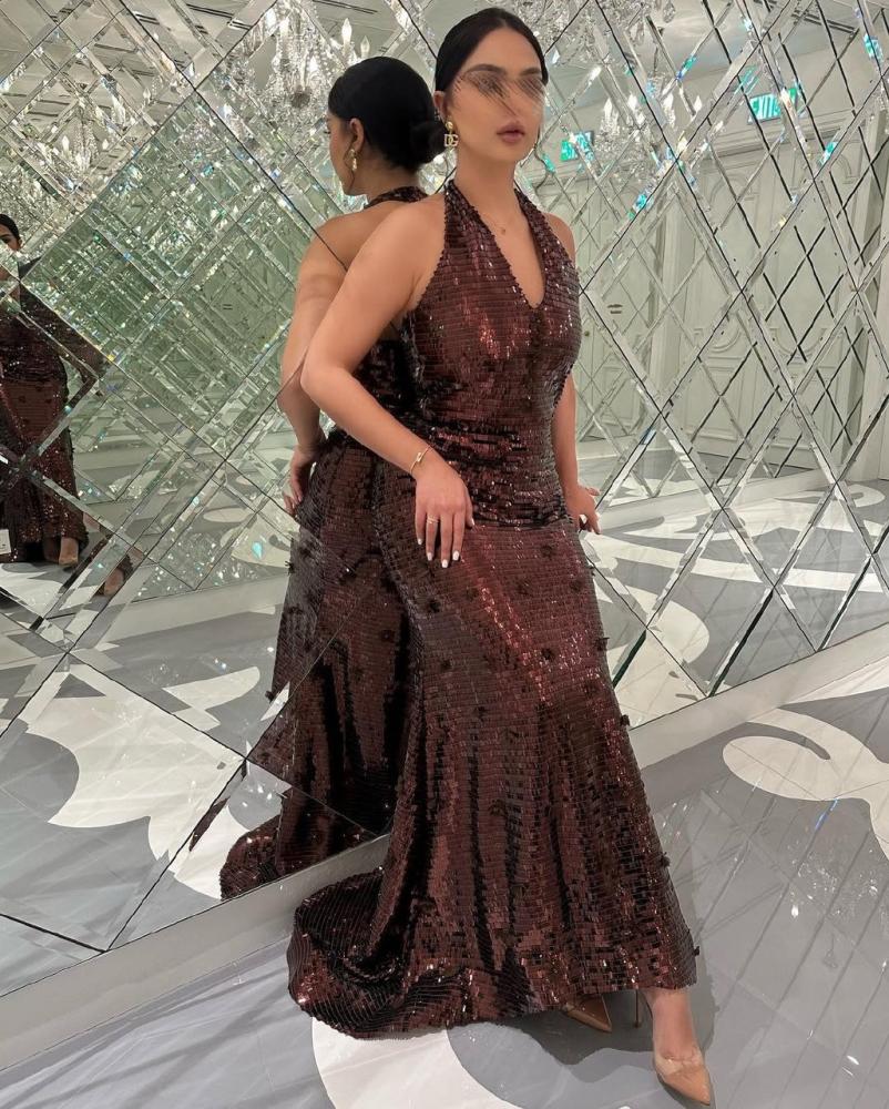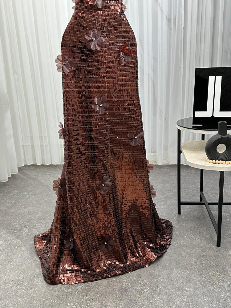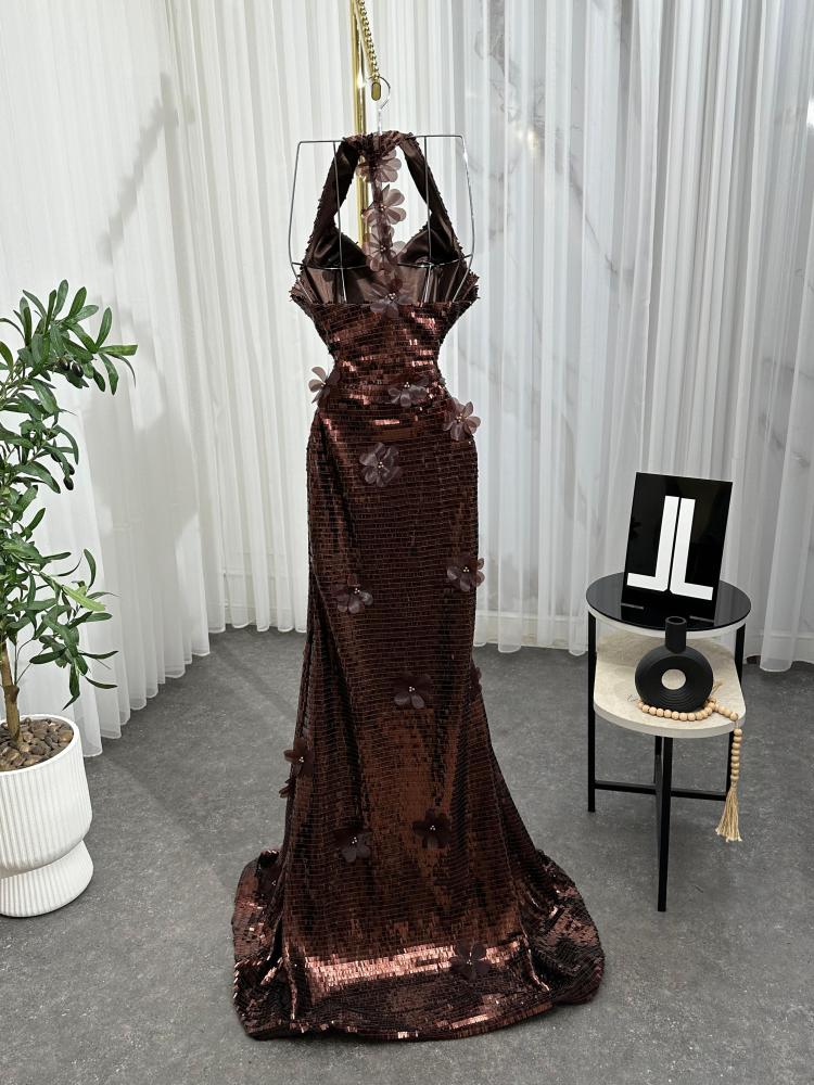 هذا الفستان البنيّ اللامع يجسد الأناقة والجاذبية، مثالي للمناسبات الخاصة.