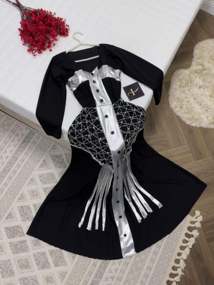 يُضفي هذا الفستان لمسة من الأناقة والرقي على إطلالتك. يتميز بتصميمه المُبتكر الذي يجمع بين اللونين الأسود والفضي. يُغطي الجزء العلوي من الفستان قماش أسود ناعم، بينما يُزين الجزء السفلي من الفستان تطريزات رائعة من الخرز الفضي اللامع، مع حافة من الشرائط الفضية الطويلة. يُناسب هذا الفستان المناسبات الخاصة، والحفلات، والمناسبات الرسمية.